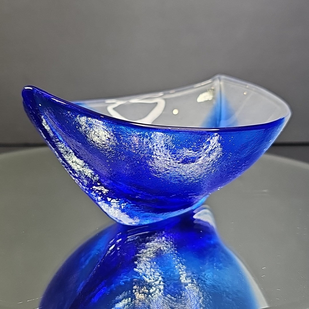 Mats Jonasson Hand Blown Glass Cobalt Blue White Dish Bowl Signed Nautical Ship